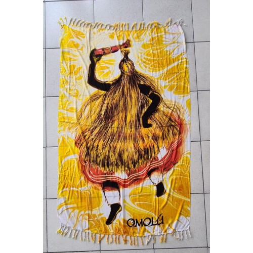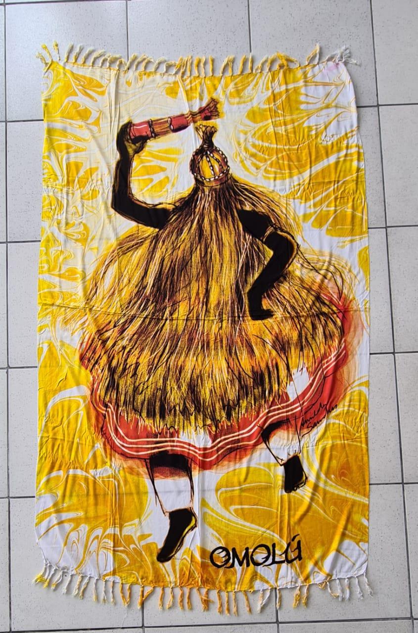 - Canga de tecido estampada, com medidas de 1,10m de largura e 1,70m de comprimento.