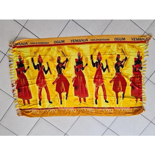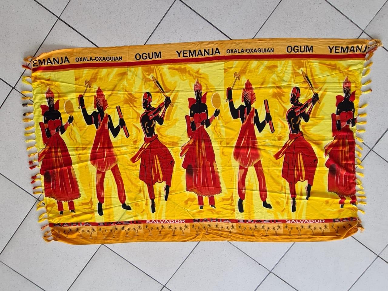 - Canga de tecido estampada, com medidas de 1,10m de largura e 1,70m de comprimento.