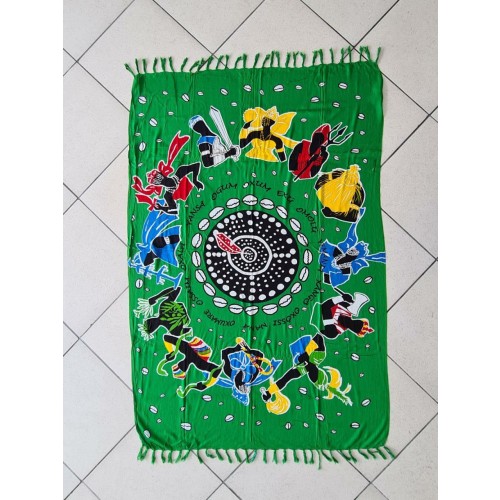 - Canga de tecido estampada, com medidas de 1,10m de largura e 1,70m de comprimento.