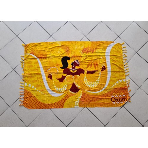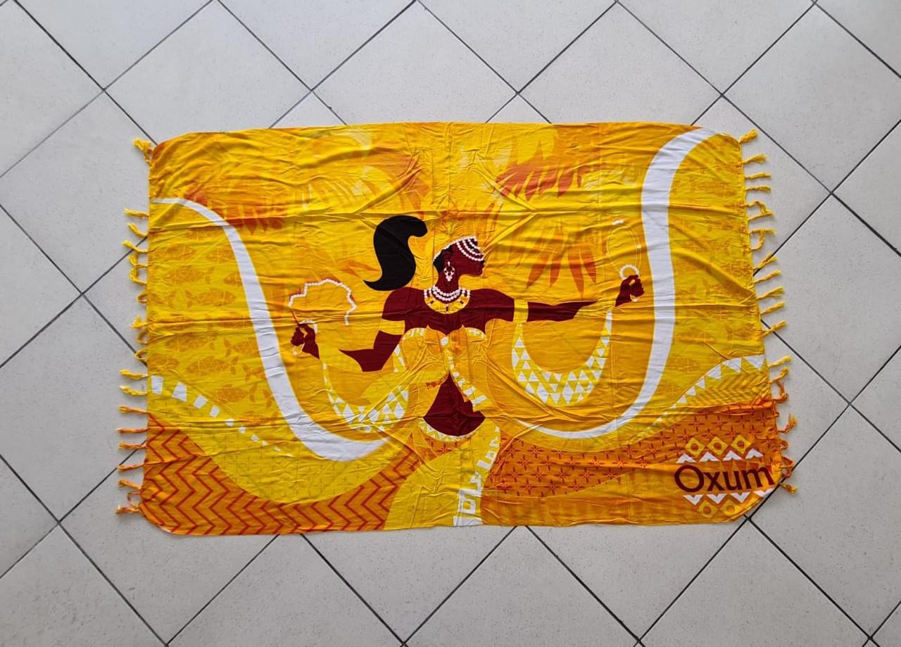 - Canga de tecido estampada, com medidas de 1,10m de largura e 1,70m de comprimento.