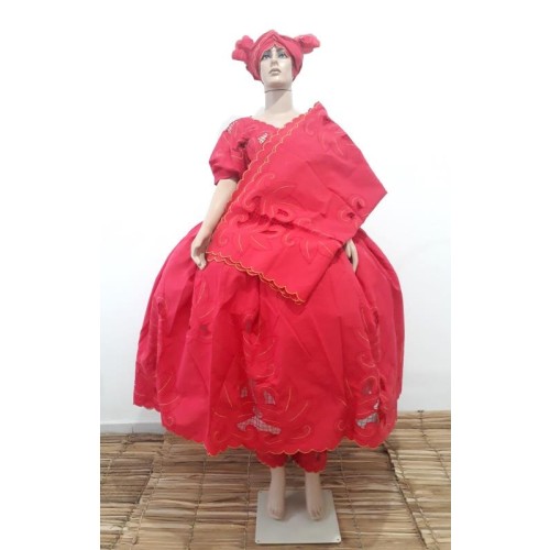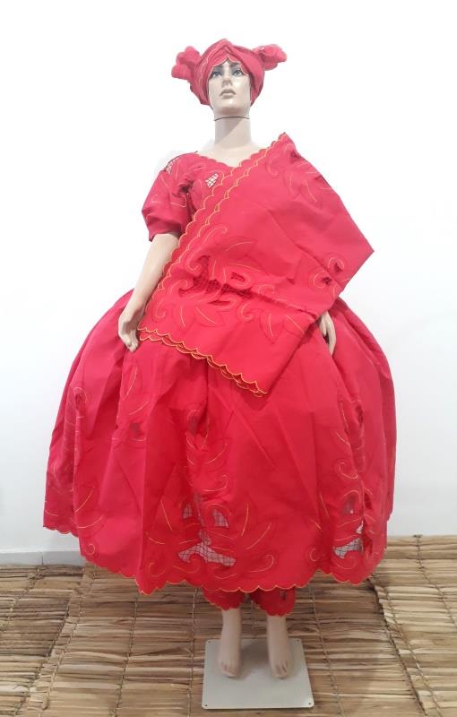 - Conjunto Baiana com 6 pecas, contendo pano de cabeca, pano da costa, calcolao, camisu, bata e saia.